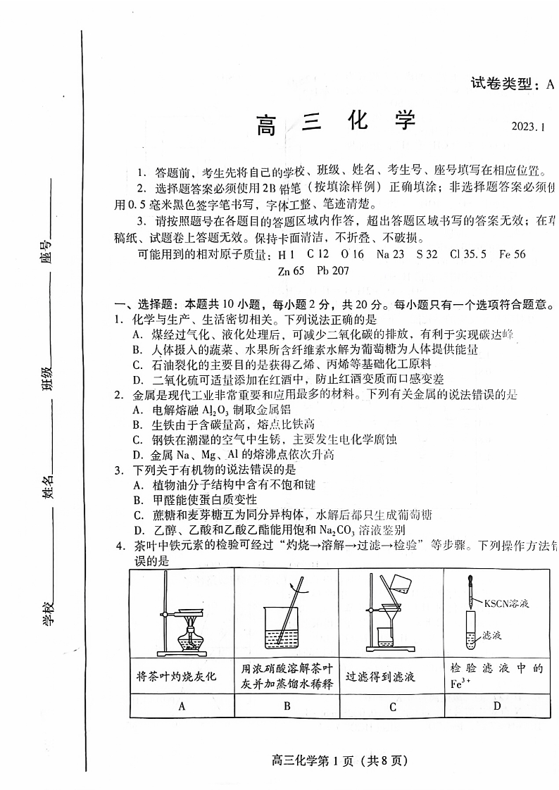 高三化学--山东省潍坊2023届高三期末联考
