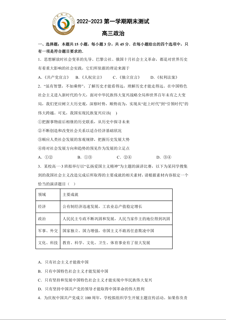 高三政治+答案--山东省青岛第二中学高三上学期1月期末