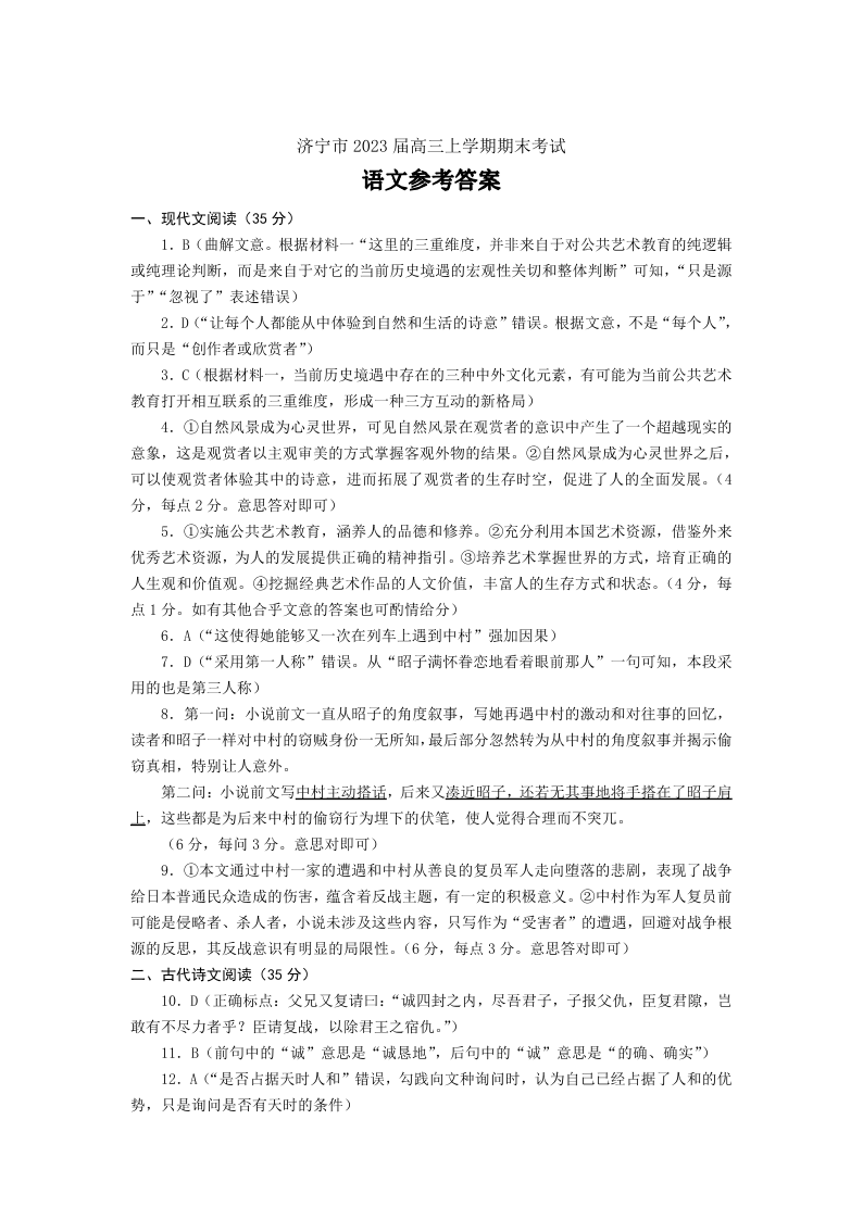 高三语文答案--山东省济宁市2022-2023学年高三上学期期末