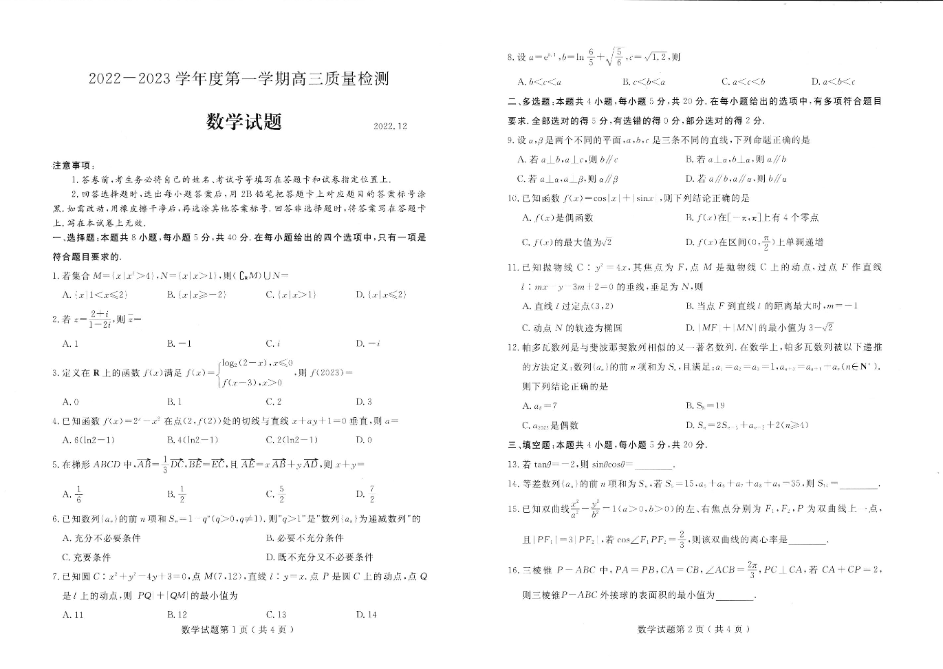 高三数学--山东省济宁市2022-2023学年高三上学期期末