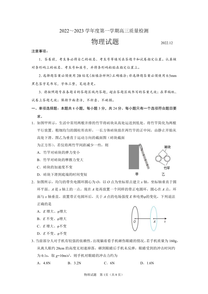 高三物理--山东省济宁市2022-2023学年高三上学期期末