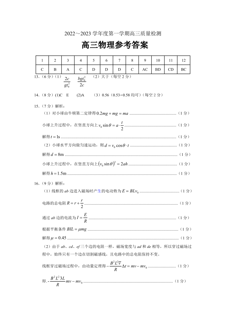 高三物理答案--山东省济宁市2022-2023学年高三上学期期末