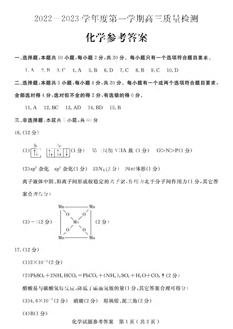 高三化学答案--山东省济宁市2022-2023学年高三上学期期末