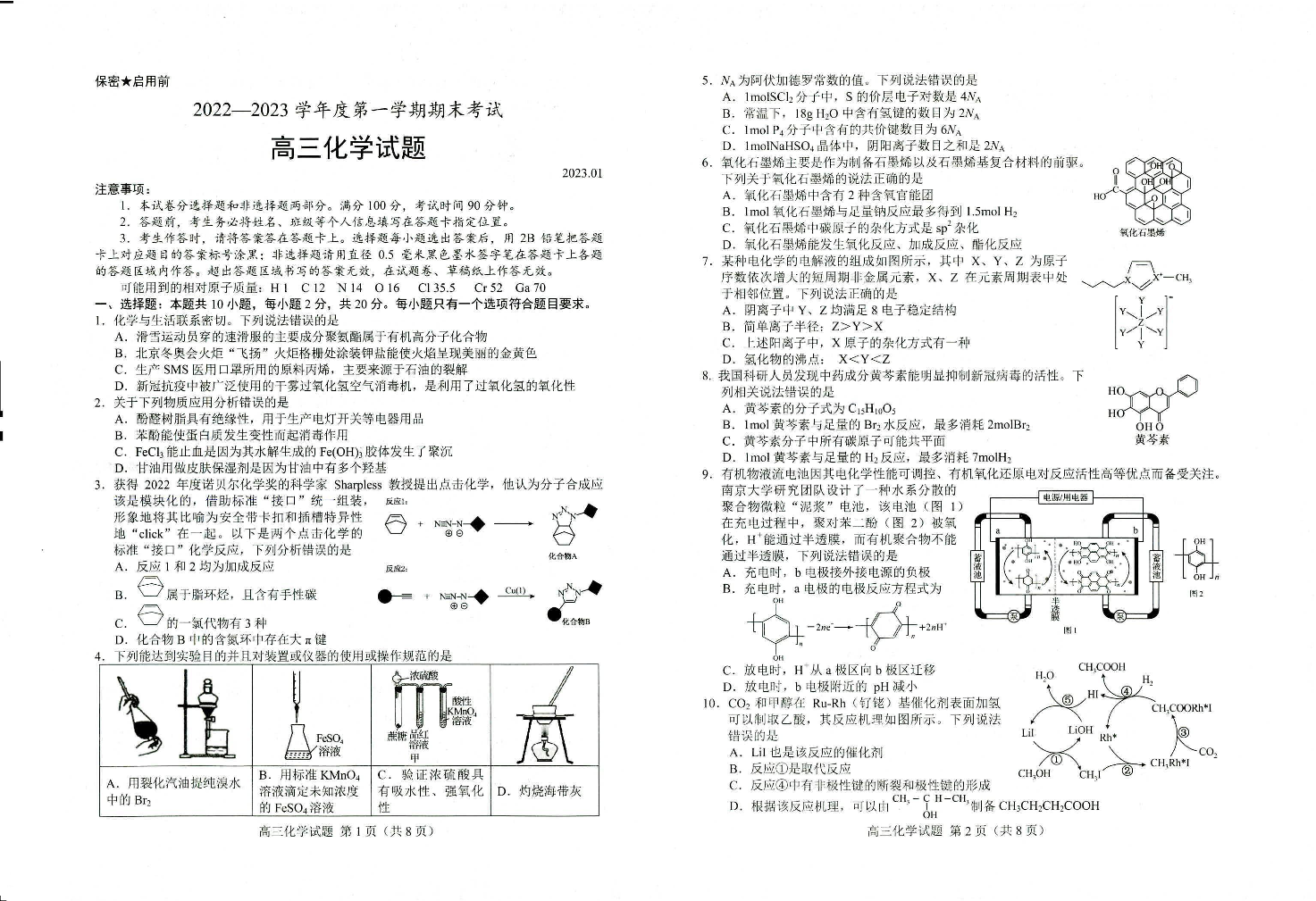 高三化学+答案--山东省菏泽市2023届高三上学期期末考试
