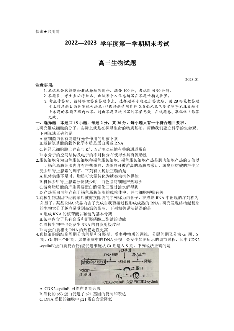 高三生物--山东省菏泽市2023届高三上学期期末考试