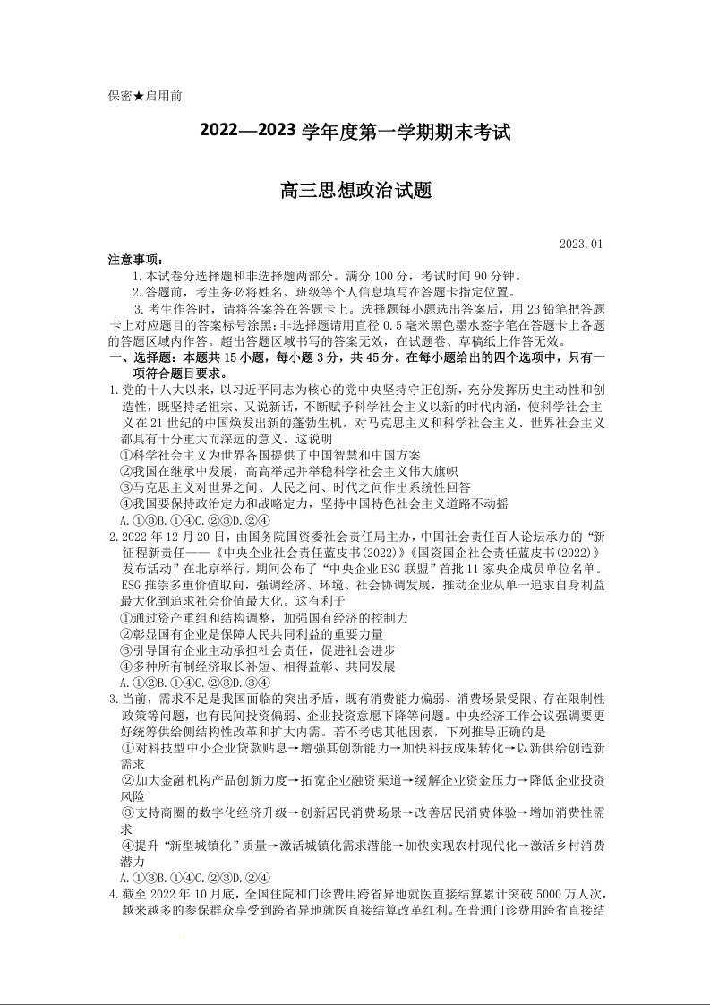 高三政治--山东省菏泽市2023届高三上学期期末考试