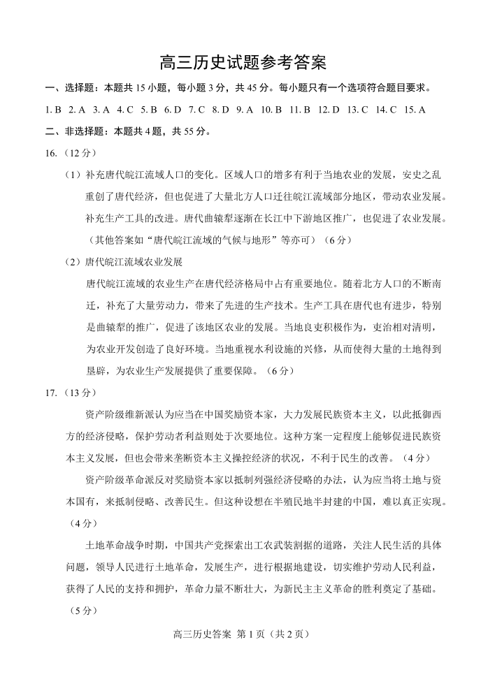高三历史答案--山东省菏泽市2023届高三上学期期末考试
