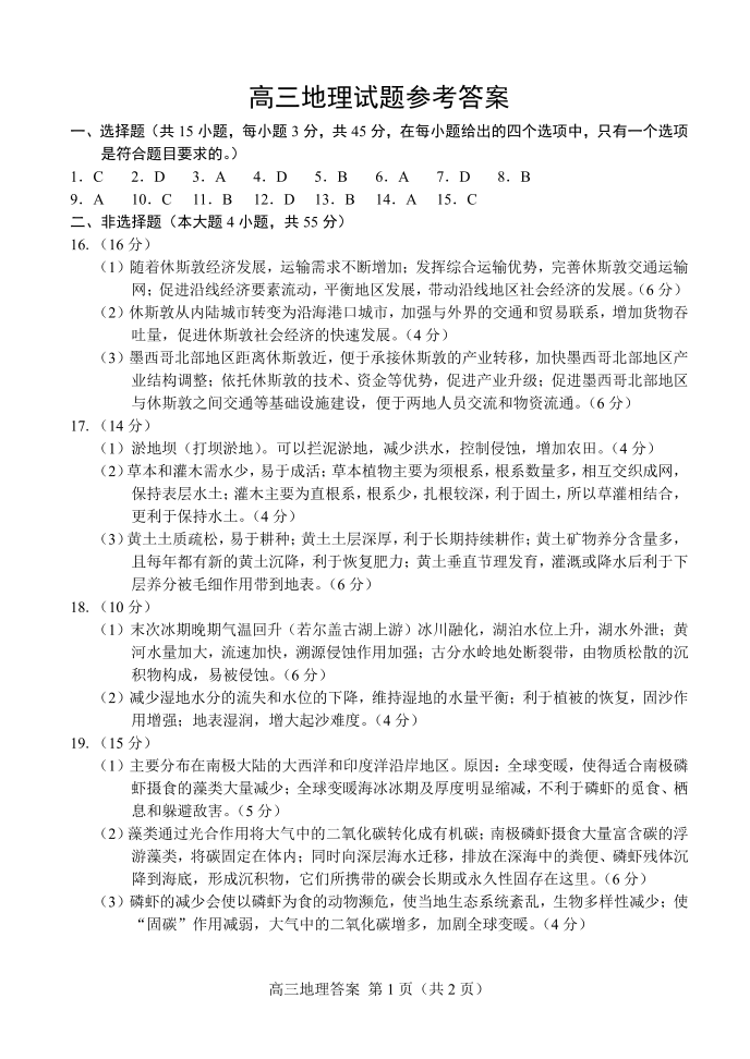 高三地理答案--山东省菏泽市2023届高三上学期期末考试
