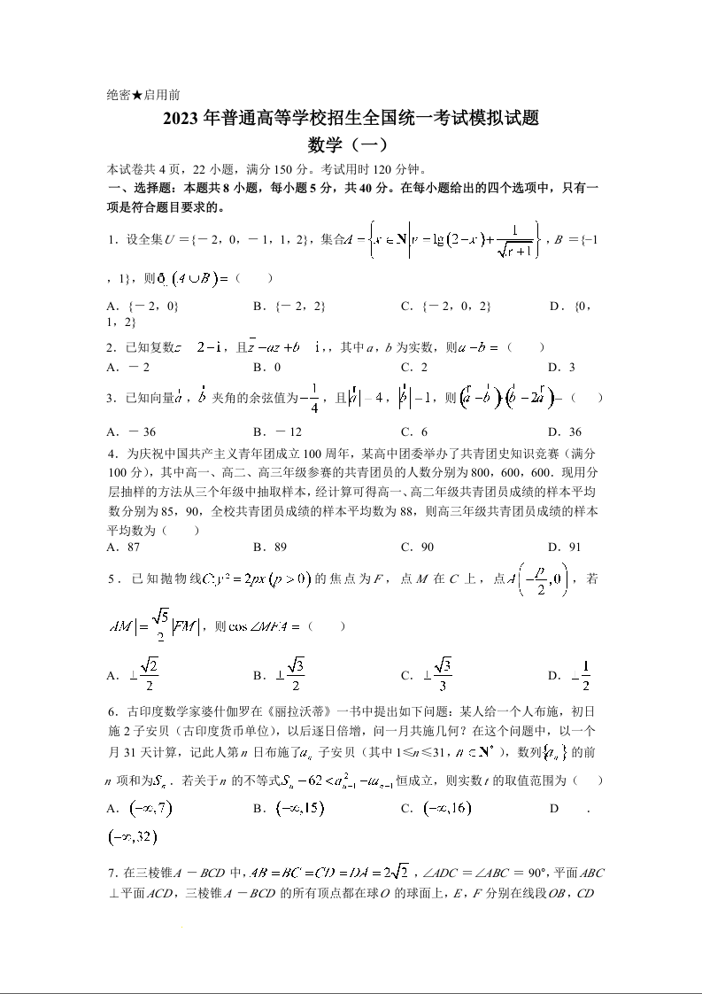 高三数学+答案--辽宁省名校联盟2023届高考模拟调研卷(一)