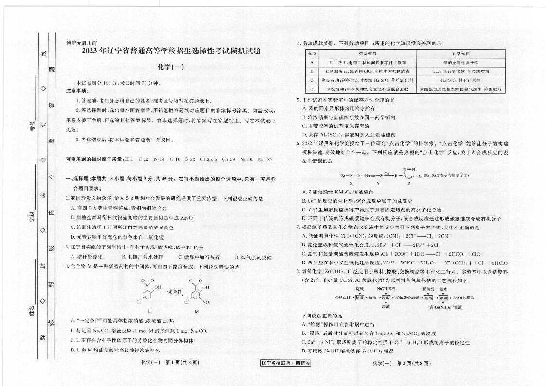 高三化学--辽宁省名校联盟2023届高考模拟调研卷(一)