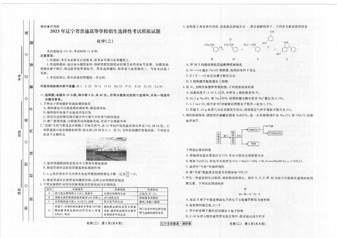 高三化学--辽宁省名校联盟2023届高考模拟调研卷(二)