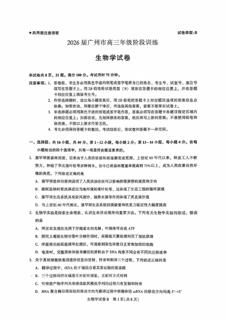 高三生物--广东省广州市2026届高三年级8月阶段训练
