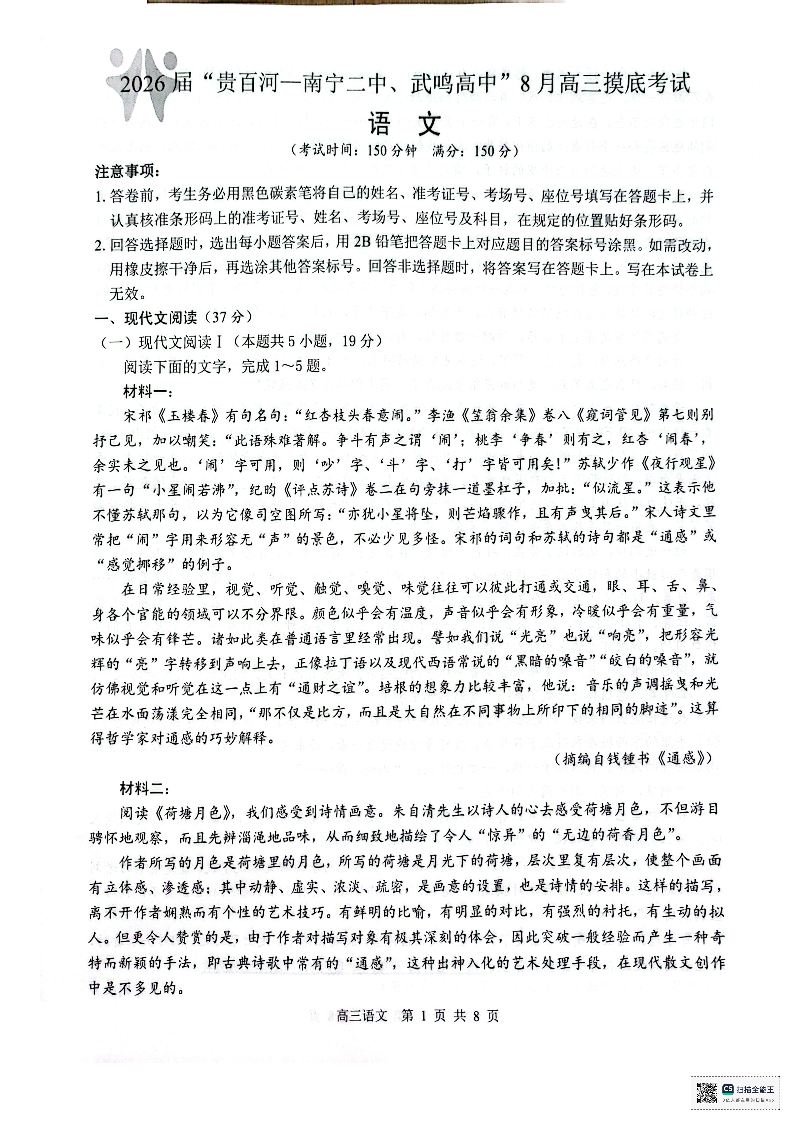 高三语文--广西省“贵百河一南宁二中、武鸣高中”2026届8月高三摸底考试