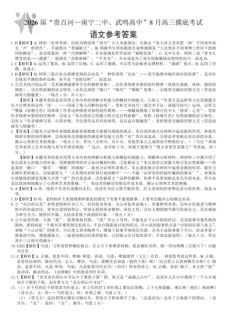 高三语文答案--广西省“贵百河一南宁二中、武鸣高中”2026届8月高三摸底考试