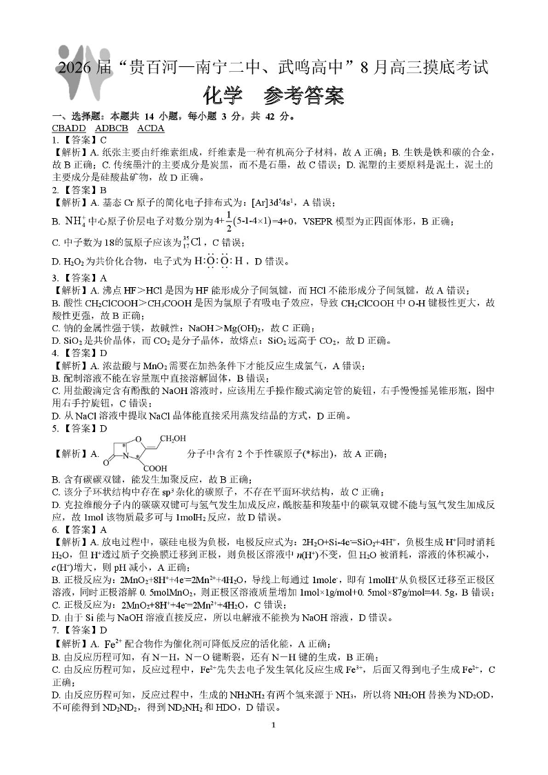 高三化学答案--广西省“贵百河一南宁二中、武鸣高中”2026届8月高三摸底考试