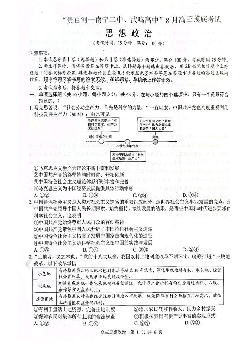 高三政治+答案--广西省“贵百河一南宁二中、武鸣高中”2026届8月高三摸底考试