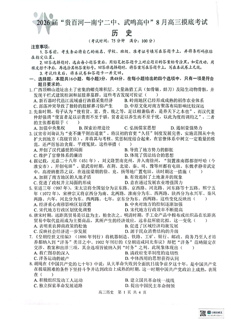 高三历史--广西省“贵百河一南宁二中、武鸣高中”2026届8月高三摸底考试