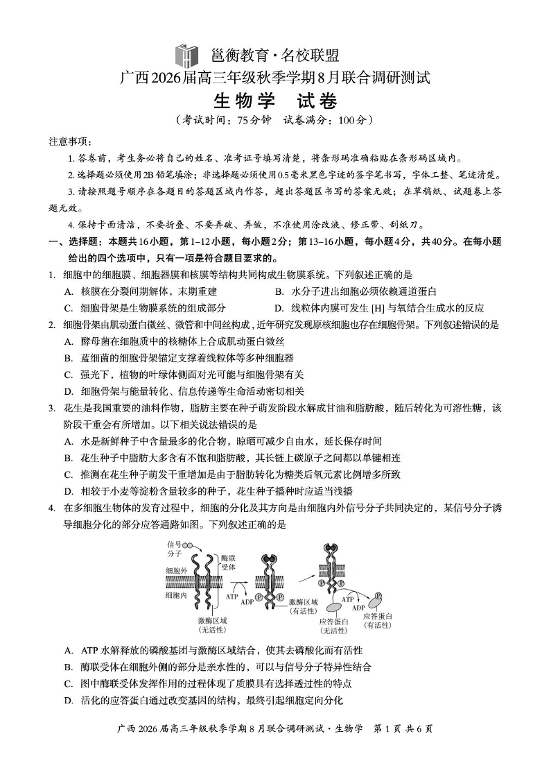 高三生物--广西邕衡教育·名校联盟2026届新高考秋季学期8月适应性联合测试