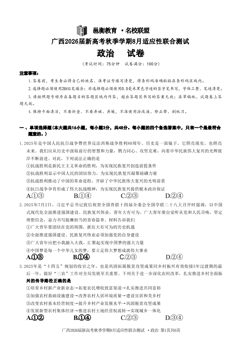 高三政治+答案--广西邕衡教育·名校联盟2026届新高考秋季学期8月适应性联合测试