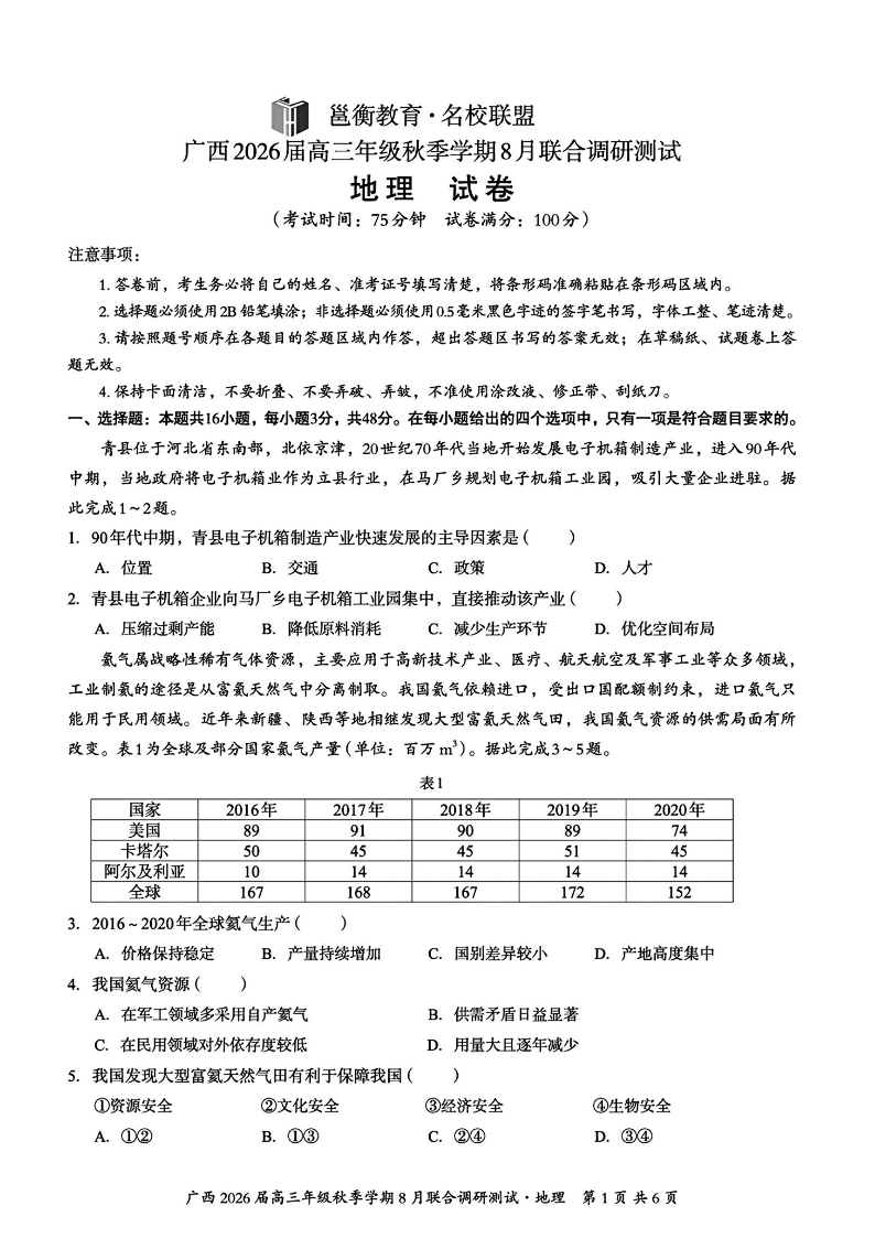 高三地理+答案--广西邕衡教育·名校联盟2026届新高考秋季学期8月适应性联合测试