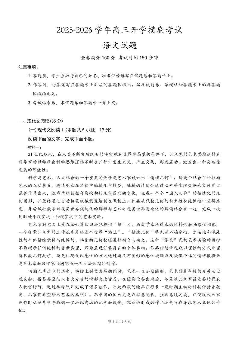 高三语文+答案 --河北省衡水市冀州中学2026届高三上学期开学摸底考试
