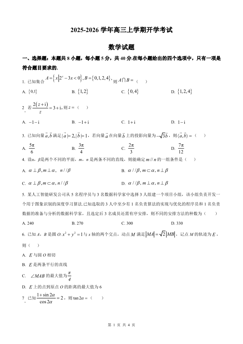 高三数学+答案 --河北省衡水市冀州中学2026届高三上学期开学摸底考试