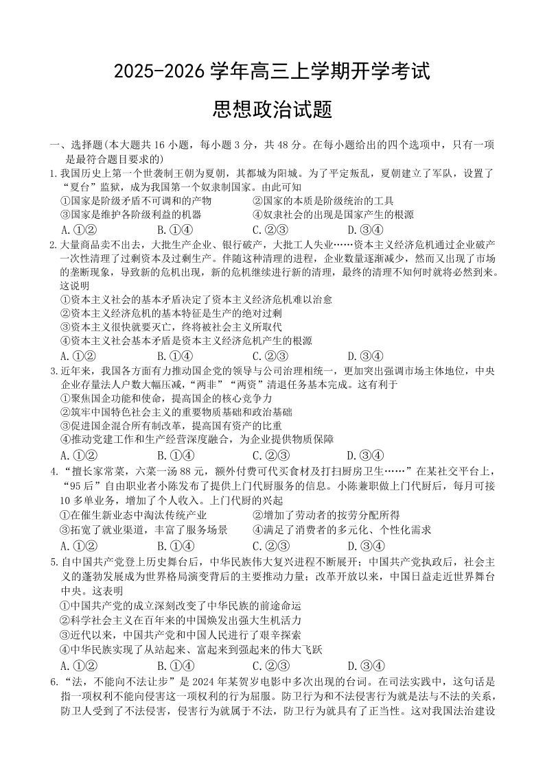 高三政治+答案 --河北省衡水市冀州中学2026届高三上学期开学摸底考试