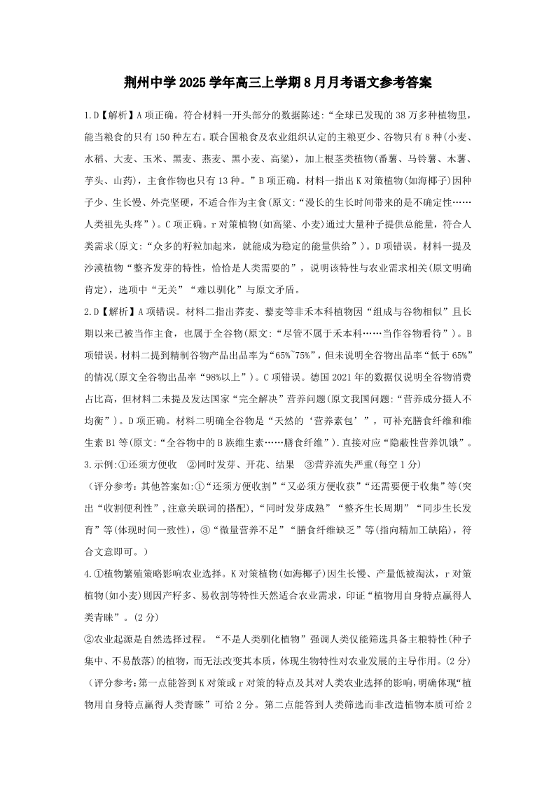 高三语文答案--湖北省荆州中学2026届高三上学期8月月考