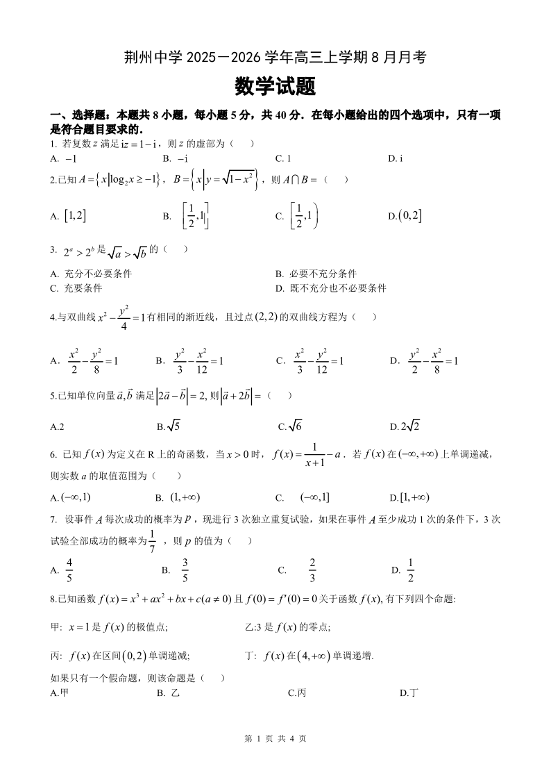 高三数学--湖北省荆州中学2026届高三上学期8月月考