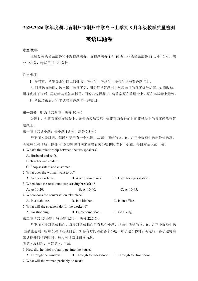 高三英语+答案--湖北省荆州中学2026届高三上学期8月月考