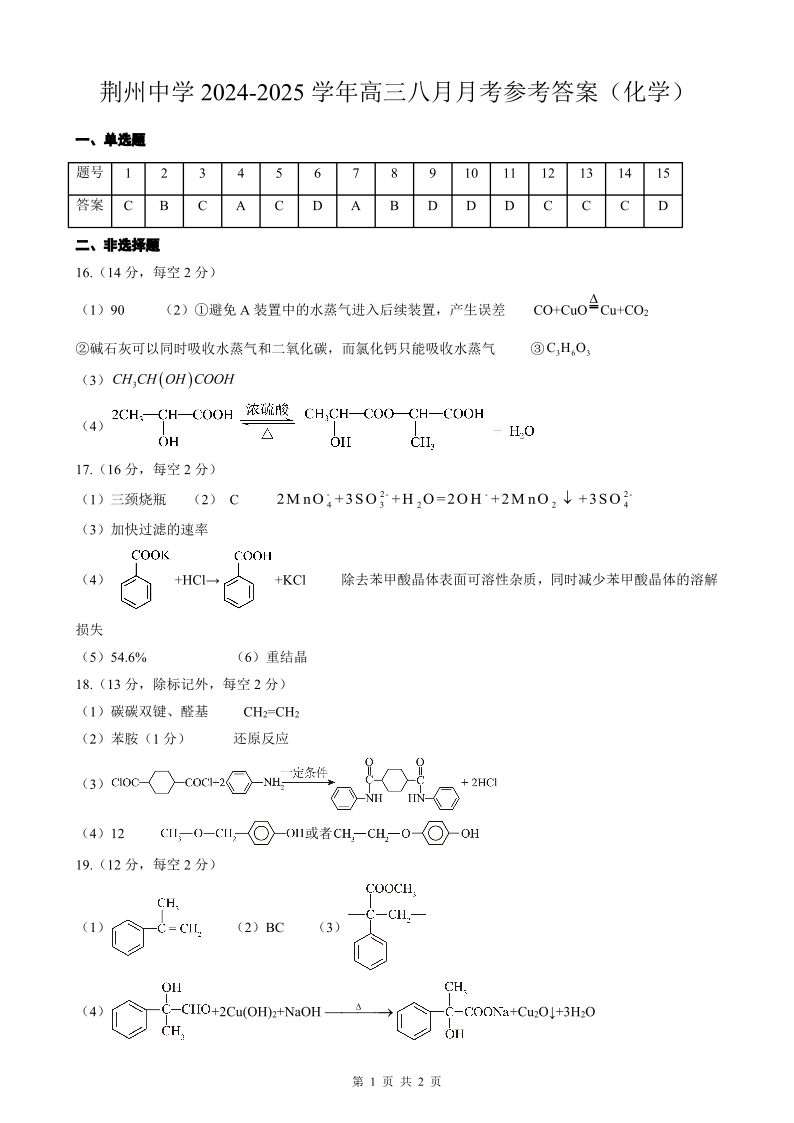 高三化学答案--湖北省荆州中学2026届高三上学期8月月考