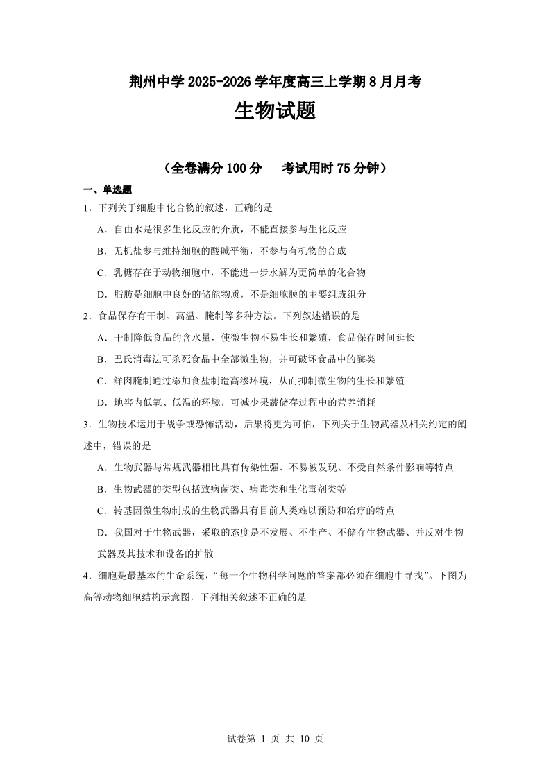 高三生物--湖北省荆州中学2026届高三上学期8月月考