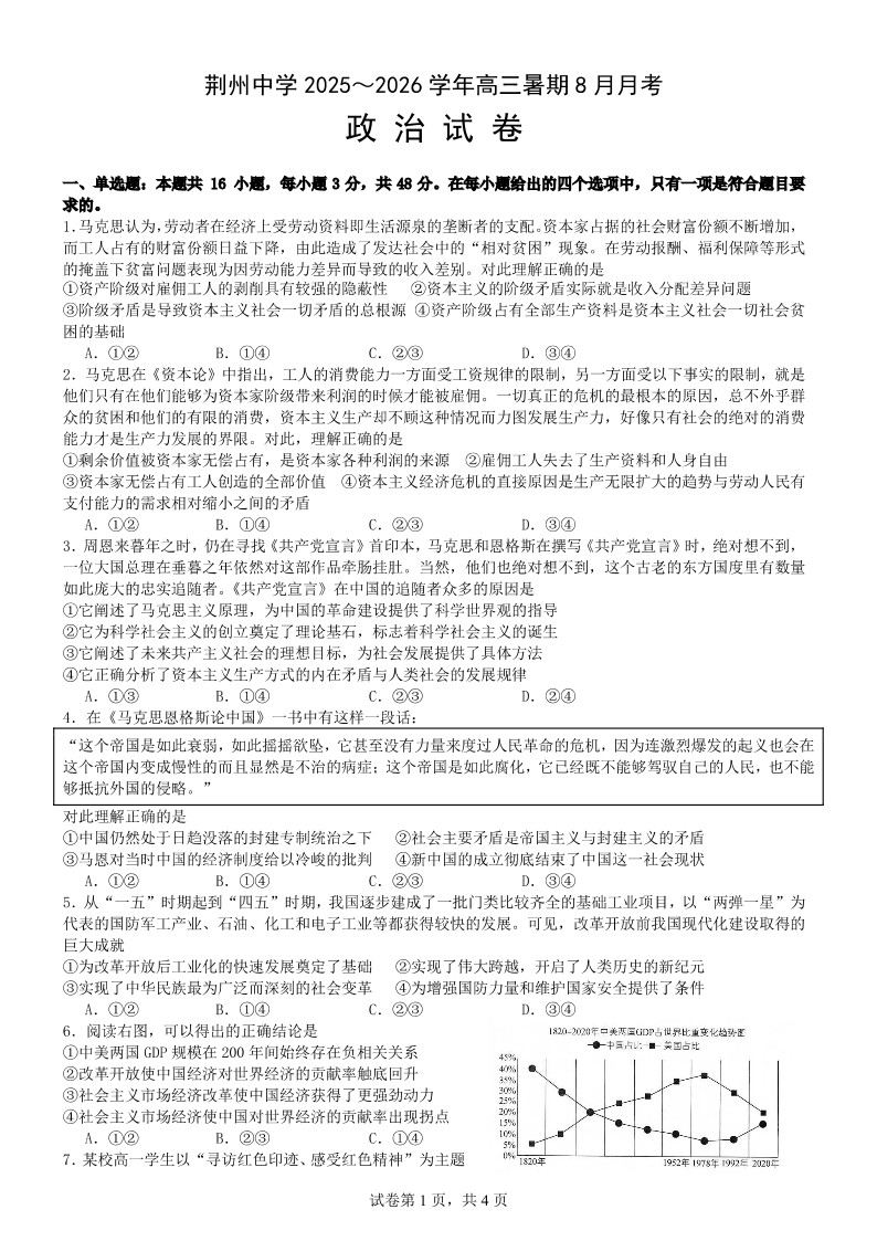 高三政治--湖北省荆州中学2026届高三上学期8月月考