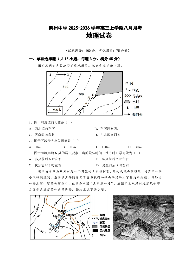高三地理--湖北省荆州中学2026届高三上学期8月月考