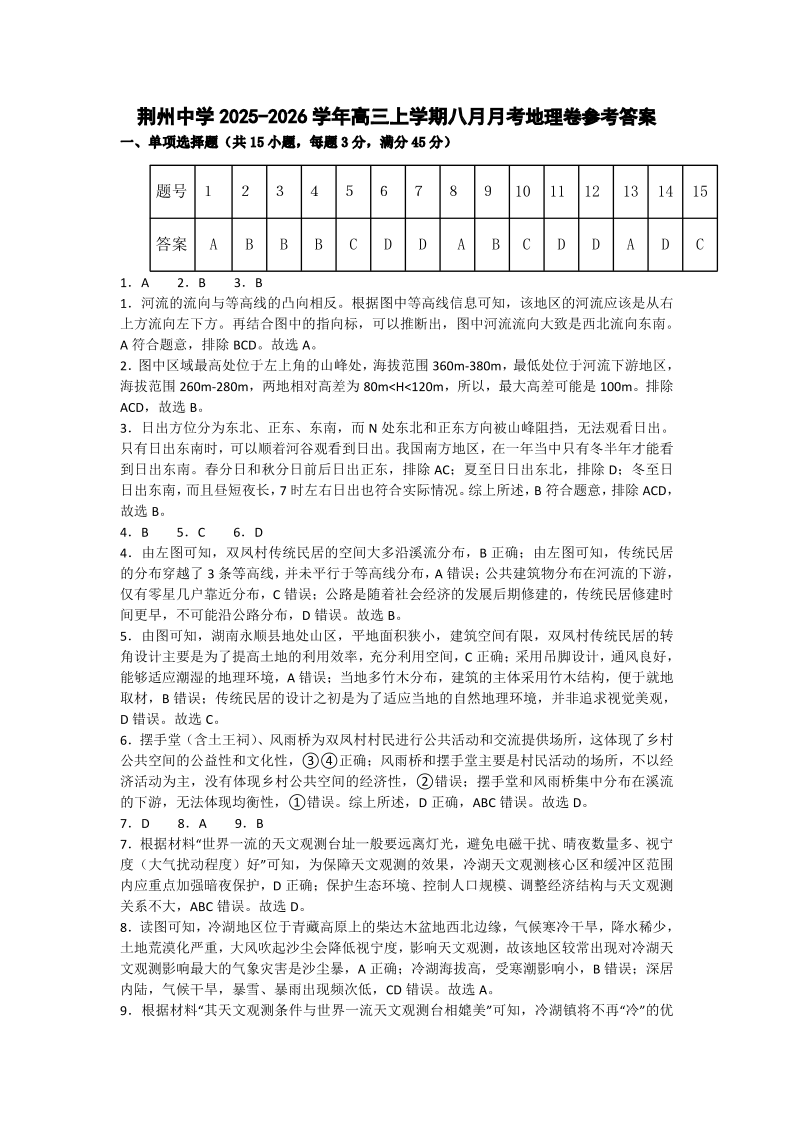 高三地理答案--湖北省荆州中学2026届高三上学期8月月考