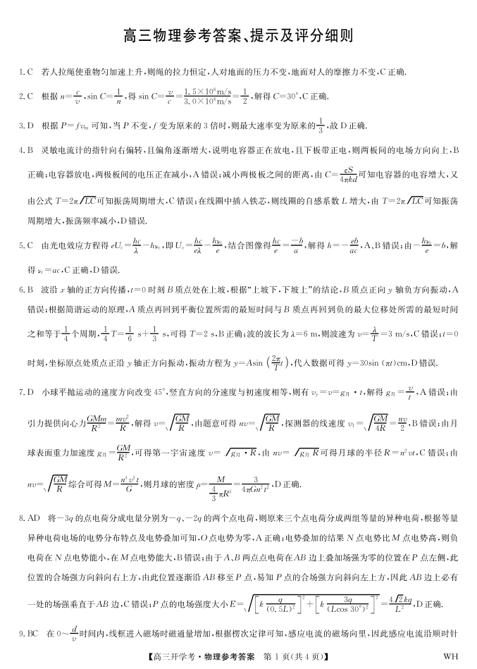 高三物理答案--湖北省九师联盟2026届高三上学期8月开学考试