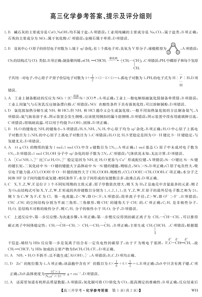 高三化学答案--湖北省九师联盟2026届高三上学期8月开学考试