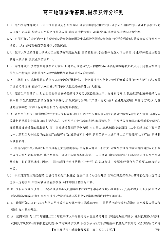 高三地理答案--湖北省九师联盟2026届高三上学期8月开学考试