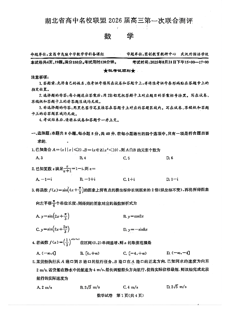 高三数学--湖北省圆创高中名校联盟2026届高三第一次联合测评