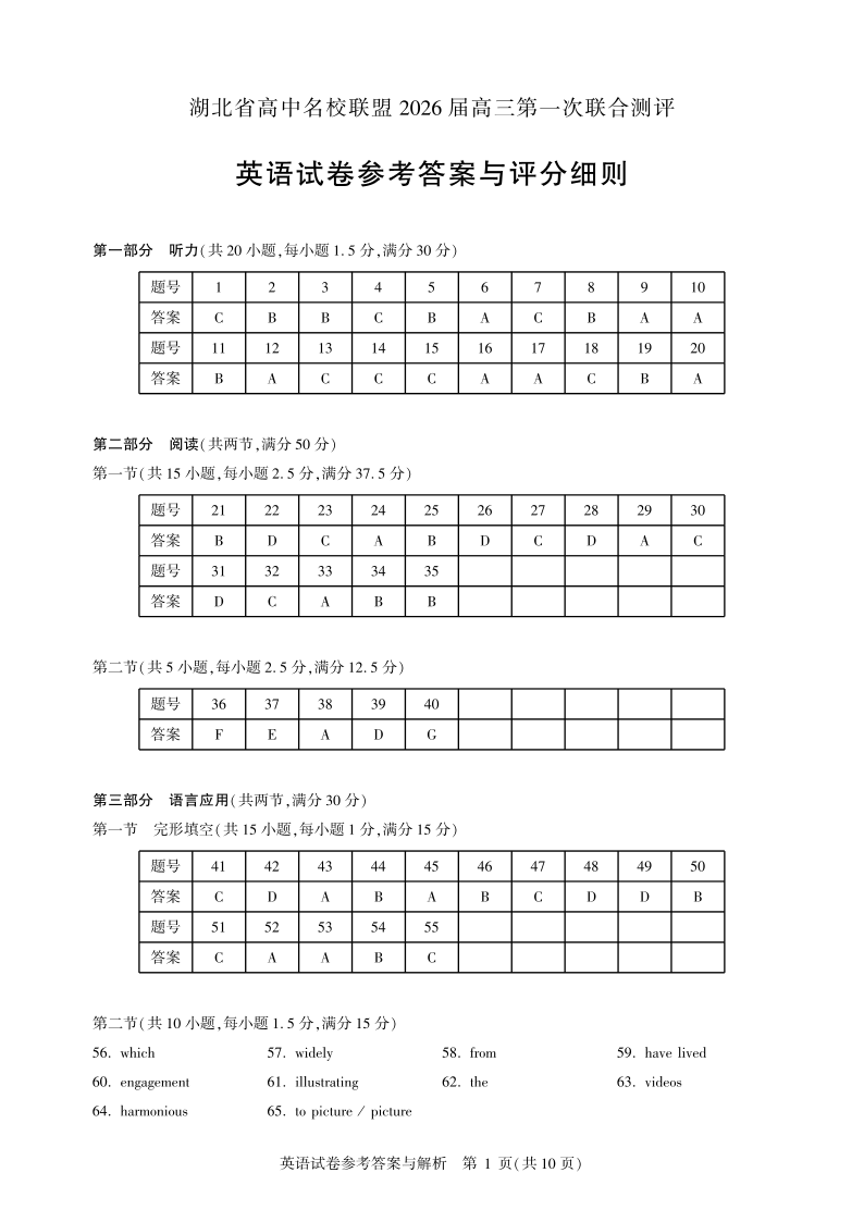 高三英语答案--湖北省圆创高中名校联盟2026届高三第一次联合测评