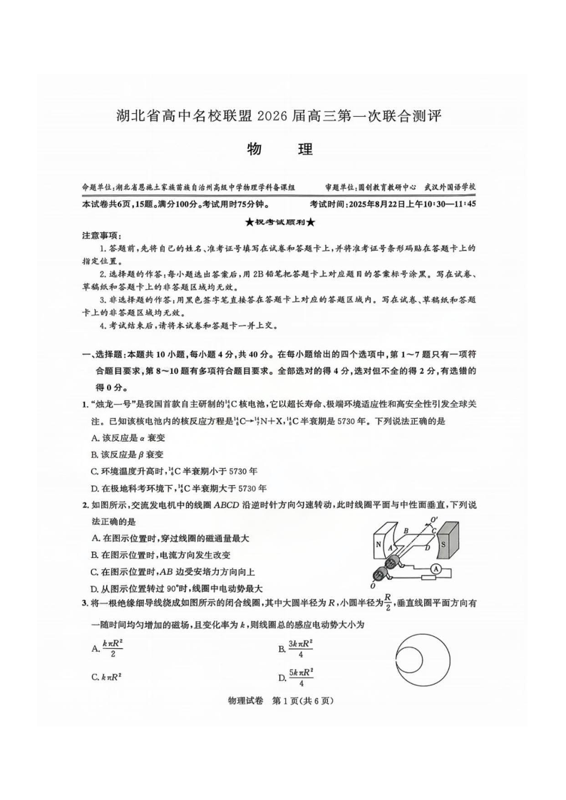 高三物理--湖北省圆创高中名校联盟2026届高三第一次联合测评