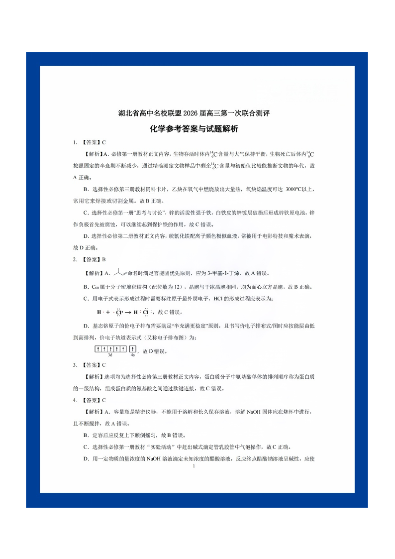 高三化学答案--湖北省圆创高中名校联盟2026届高三第一次联合测评