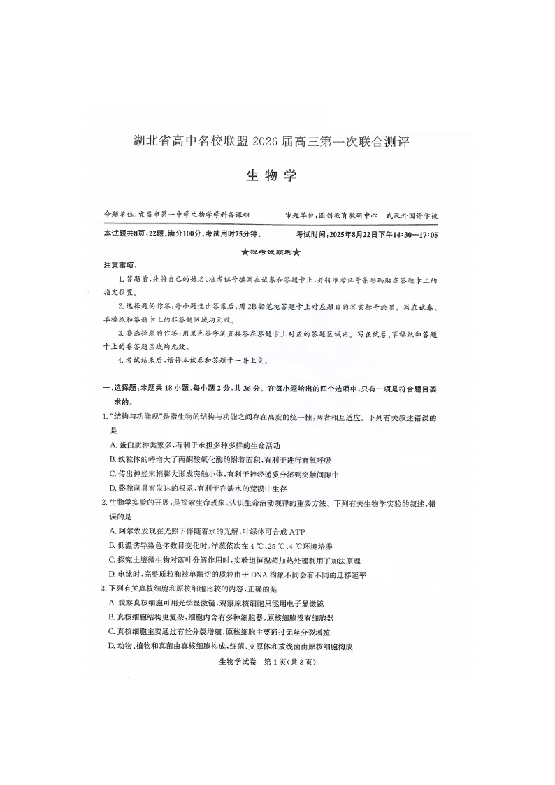高三生物--湖北省圆创高中名校联盟2026届高三第一次联合测评