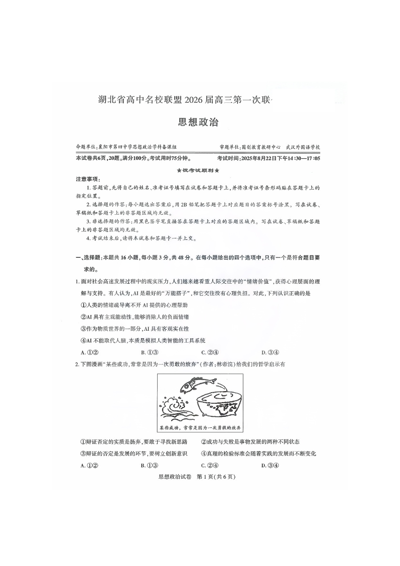 高三政治--湖北省圆创高中名校联盟2026届高三第一次联合测评