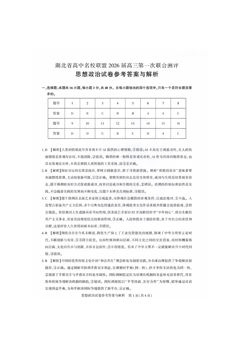 高三政治答案--湖北省圆创高中名校联盟2026届高三第一次联合测评