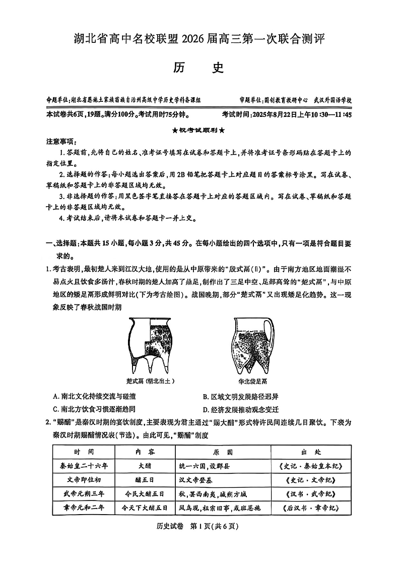 高三历史--湖北省圆创高中名校联盟2026届高三第一次联合测评