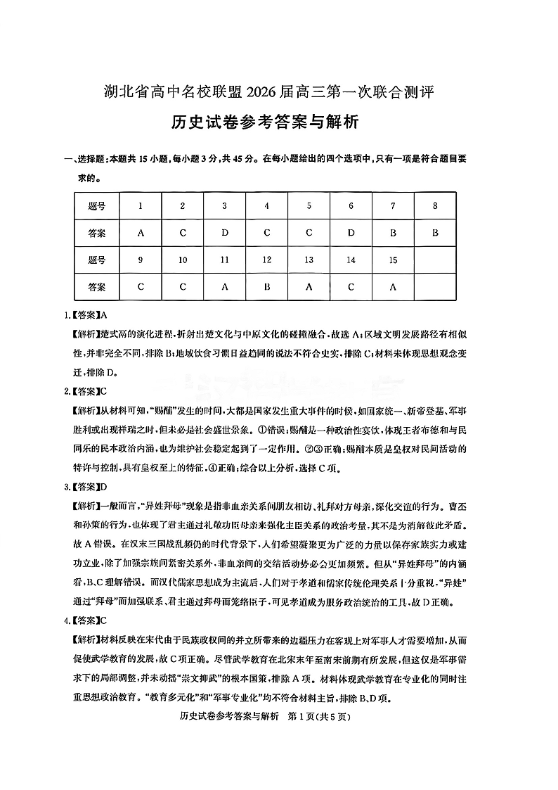 高三历史答案--湖北省圆创高中名校联盟2026届高三第一次联合测评