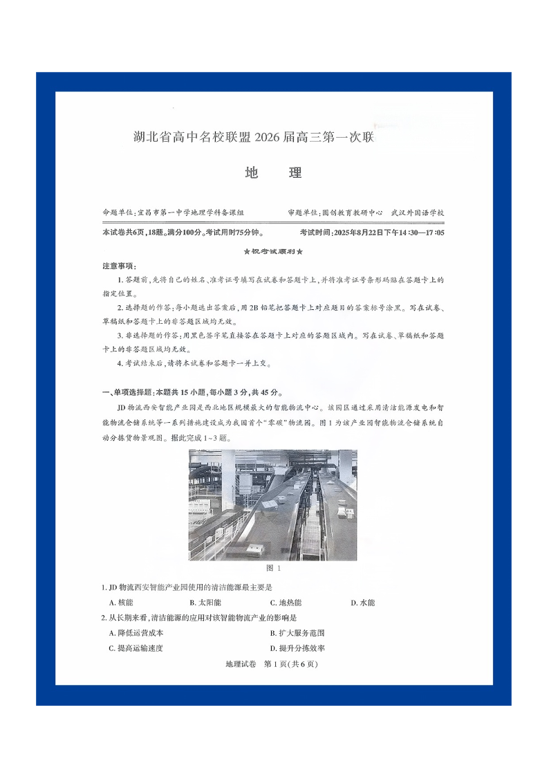 高三地理--湖北省圆创高中名校联盟2026届高三第一次联合测评