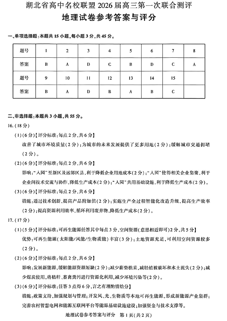高三地理答案--湖北省圆创高中名校联盟2026届高三第一次联合测评