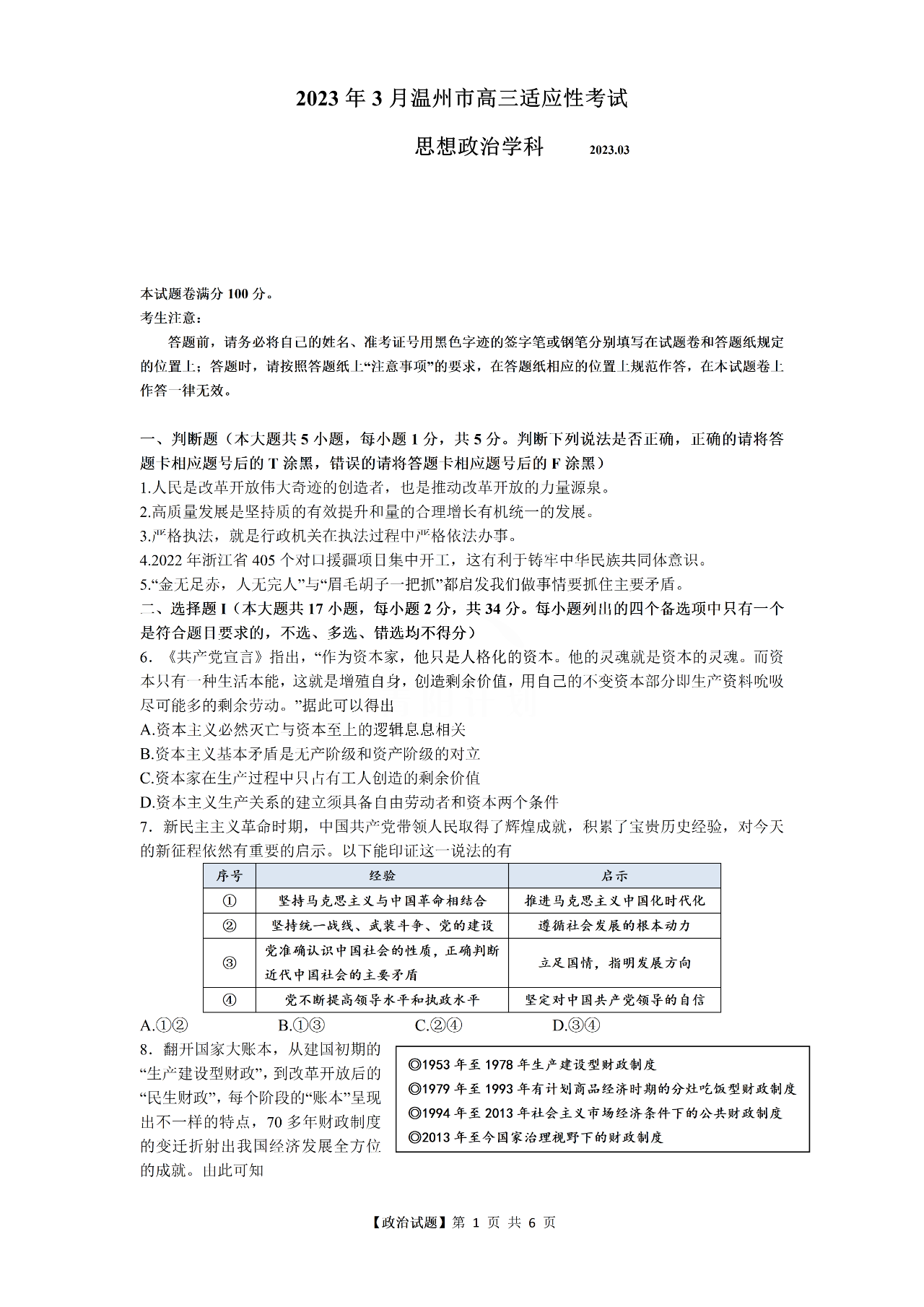 高三政治--浙江省温州市普通高中2023届高三第二次适应性考试